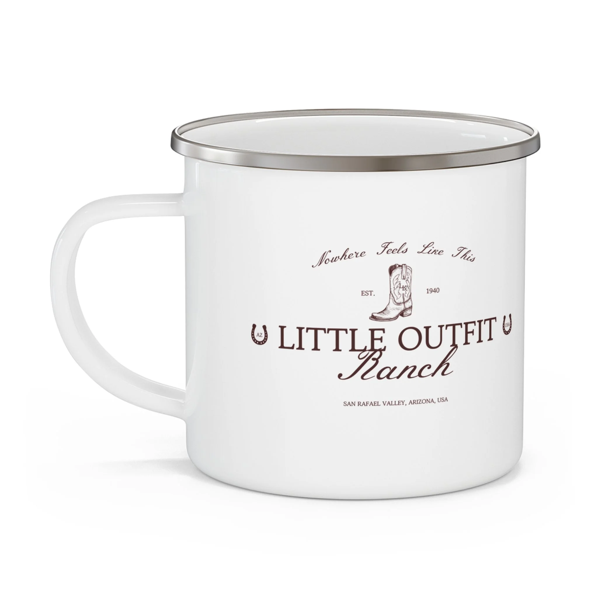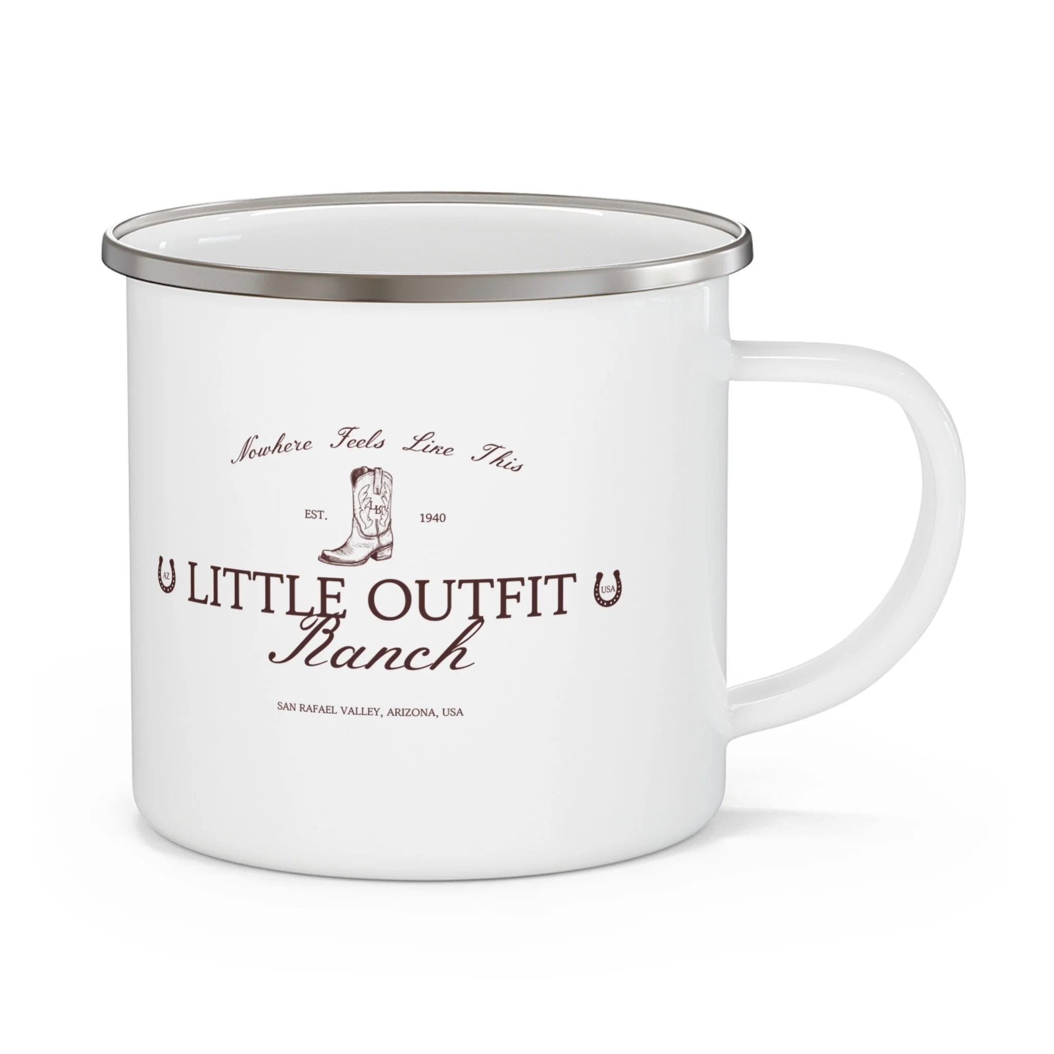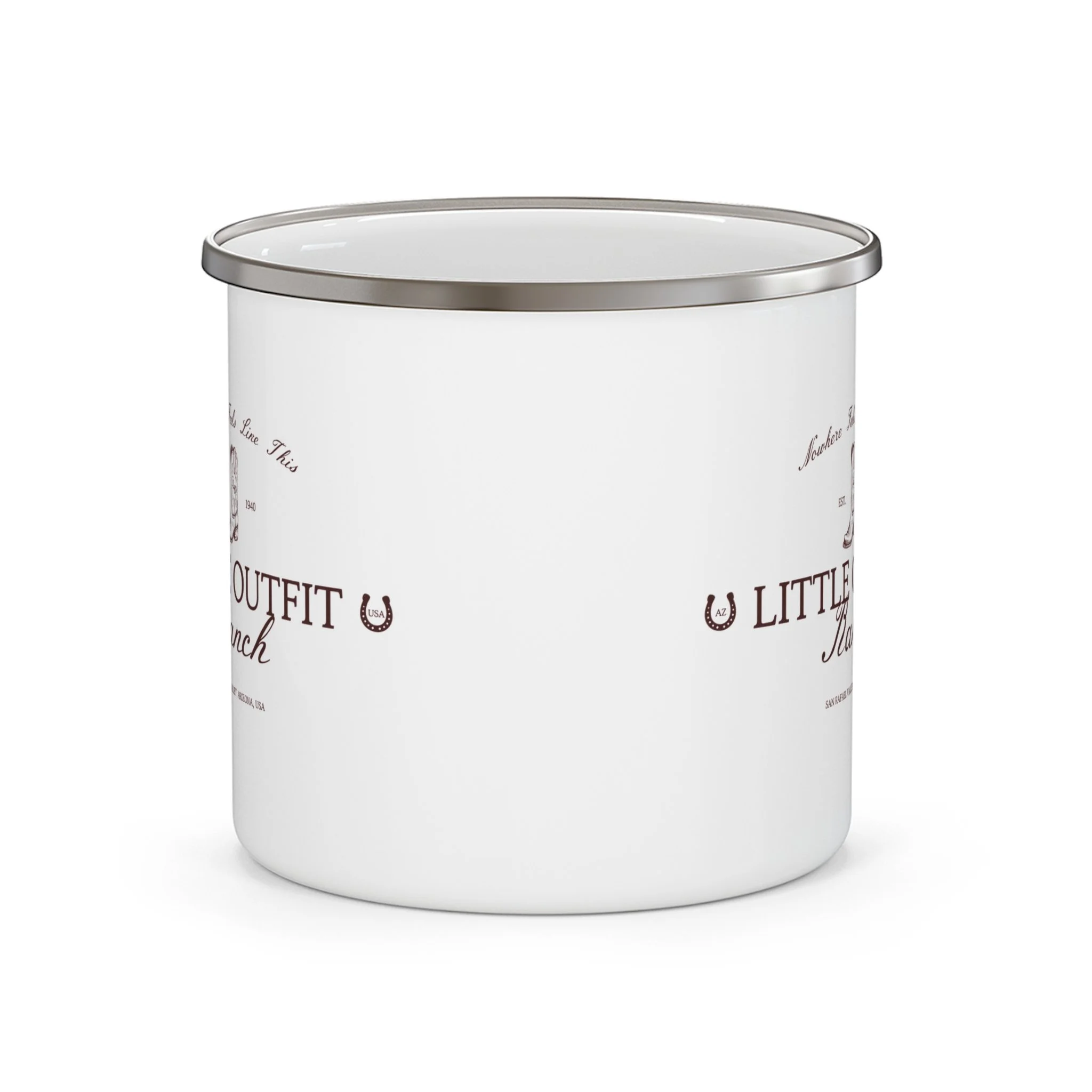 The Campfire Mug is a classic enamel mug stamped with the Little Outfit Ranch wordmark—a quiet nod to early mornings in the San Rafael Valley, when coffee is poured before the sun clears the hills.